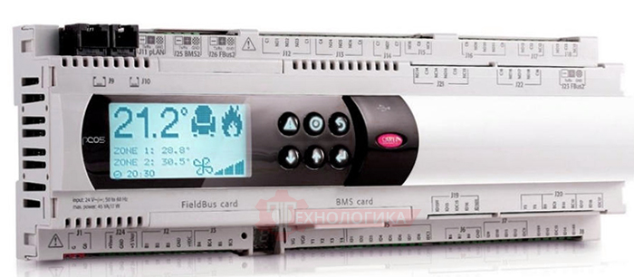 В базовой комплектации доступны Modbus Master/Slave и pLAN, а также расширение MS/FieldBus картами (BACnet, CANbus, LON, Ethernet, MP-Bus).Контроллер крепится на DIN-рейку